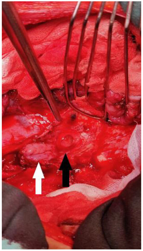 Intraoperative image showing a defect on the left main bronchus (black arrow) and the esophageal flap prepared for suturing (white arrow). This image was taken after the gastric tube had been disconnected and the esophageal flap prepared. The surrounding tissue was fibrotic. The esophageal flap was well vascularized and had sufficient length.