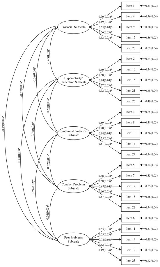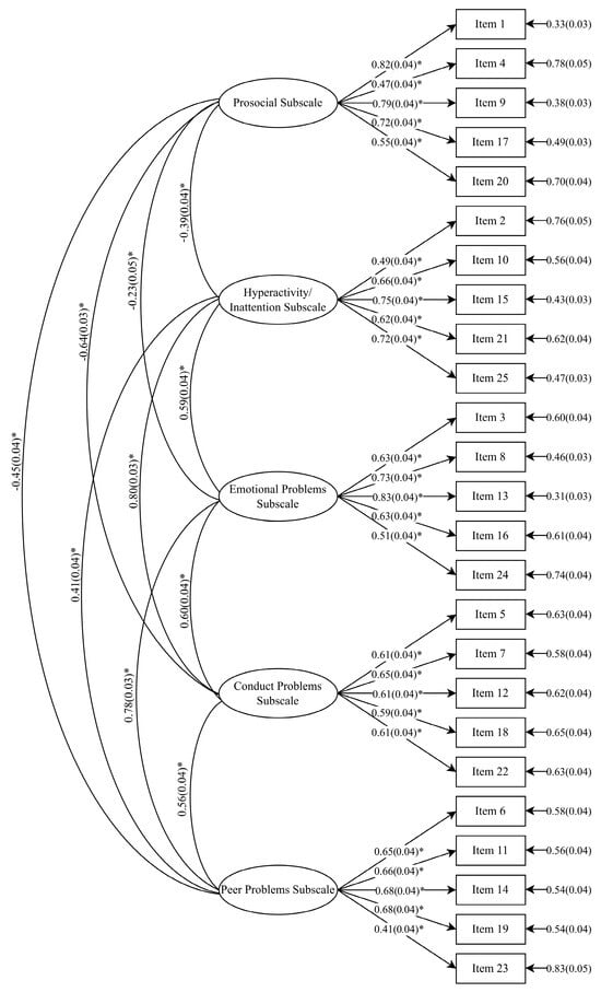 Coefficients from five-factor model of the SDQ for female subsample (* indicates a significant coefficient).