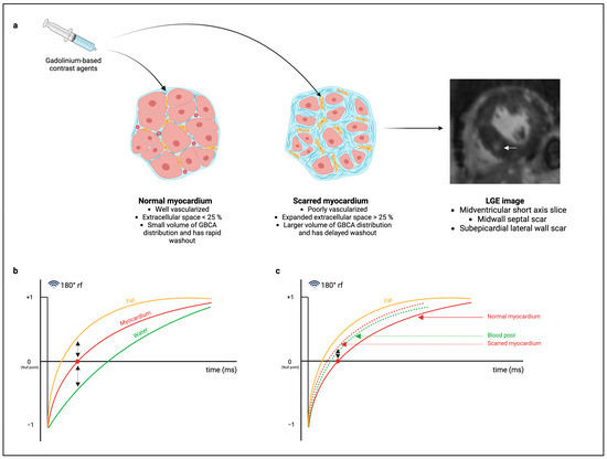 Graphical illustration of scar imaging using late gadolinium enhancement (LGE) imaging. (a) The administration of gadolinium-based contrast agents (GBCAs) fills the extracellular space of the normal (left) and scarred (middle) myocardium [19,31,33,34,36]. In scarred myocardium, there is a greater volume of distribution of GBCAs with delayed washout [19,31,33,34,36]. The GBCA in scarred myocardium shortens the T1 relaxation time, the effect of which is encoded into the LGE image, allowing for scar detection, as shown in the LGE image of a patient with severe aortic stenosis (right) [19,31,33,34,36]. The white arrow illustrates a scar in the midwall of the midventricular septum. (b) Conventional LGE imaging uses a 180° preparation pulse that inverts the net longitudinal magnetization of fat, myocardium, and blood, each of which passes through a null point upon relaxation [33,34,35,36]. Imaging is performed at the null time for the myocardium, thus creating tissue contrast between bright blood, hypointense myocardium, and bright fat outside the myocardium [33,34,35,36]. (c) The presence of GBCAs shortens the T1 relaxation time, resulting in a left shift in the T1 relaxation curves for blood pool and scarred myocardium. Additional tissue contrast is thus achieved between the hypointense normal myocardium (solid red line) and scarred myocardium (dotted red line) [33,34,35,36]. The bright scar has a signal intensity comparable to that of a blood pool (dotted green line) [17,33,34,35,36,39]. Created in Biorender. Rajah, M (2024).