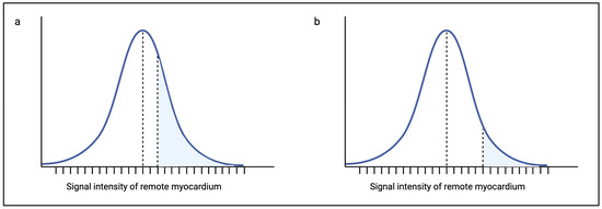 Bell curve graphs showing the range of myocardial signal intensities and application of the STRM technique for replacement fibrosis quantification. (a) Signal intensities higher than two standard deviations above the mean signal intensity of remote myocardium are considered fibrosis. The region highlighted in blue represents the range of signal intensities included as fibrosis. (b) Signal intensities higher than five standard deviations above the mean signal intensity for remote myocardium are considered fibrosis. The region highlighted in blue represents the range of signal intensities included as fibrosis. At five standard deviations above the mean signal intensity of remote myocardium, the range of signal intensities considered as fibrosis is less than the range at two standard deviations, thus introducing the risk of scar underestimation.