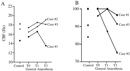 Analysis of CBF in brushing when exposed to general anesthesia (T0, T1, and T3), compared with control pre-anesthesia (control), revealed notable variations compared to the control side (Table 1). In patient #1, there was a consistent increase in CBF under general anesthesia at all time points. Conversely, patient #2 showed a mixed response. While there was an initial increase in CBF observed at 1 h under general anesthesia, a subsequent decrease was noted at 3 h compared to the control side. Patient #3 demonstrated a relatively stable response under general anesthesia. There was a slight increase in CBF at T1 followed by stable CBF levels at T3 compared to the control condition (SA). The CBF for healthy pediatric volunteers in our laboratory was 15.74 Hz ± 1.64 Hertz, measured in a sideway view and pre-culture conditions.