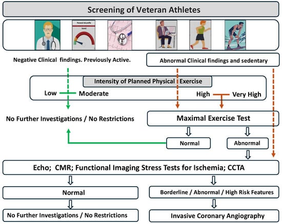 - Dores, H.; de Araújo Goncalves, P.; Monge, J.; Costa, R.; Tata, L.; Malhotra, A.; Sharma, S.; Cardim, N.; Neuparth, N. Subclinical coronary artery disease in veteran athletes: Is a new preparticipation methodology required? Br. J. Sports Med. 2018, 54, 349–353. [Google Scholar] [CrossRef]