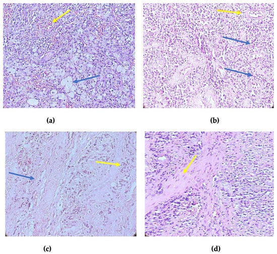 Histopathological aspects of periapical granulomas: (a) early periapical granuloma with numerous foamy macrophages (blue arrow) and blood vessels (yellow arrow); (b) intermediate periapical granuloma with mixed inflammatory infiltrate consisting of lymphocyte plasma cells and macrophages (blue arrows) and blood vessels (yellow arrow); (c) late periapical granuloma with rich connective stroma (blue arrow) and few inflammatory cells (yellow arrow); and (d) periapical granuloma (detail), inflammatory infiltrates, and fibrous stroma with prominent fibroblasts (yellow arrow). Hematoxylin–eosin staining, ×400 magnification.