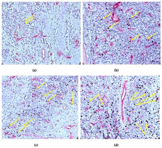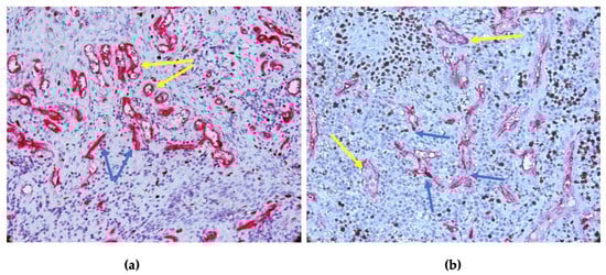 CD34 and Ki-67 co-expression was noted in the vascular endothelium, which allowed for the quantification of the vascular microdensity in relation to endothelial proliferation, as shown in Figure 5a,b.