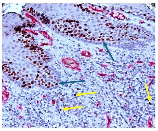 Stratified squamous epithelium with Ki-67-positive nuclei (brown, pointed to with blue arrow) in the basal area (positive control), a reduced number of Ki-67-positive nuclei in the area of the inflammatory infiltrate (brown, pointed to with the yellow arrows). CD34-Ki-67 double immunostaining, ×400 magnification.
