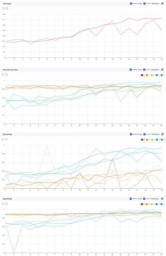While performing 20 epochs, the processing time was 42.6643 s per epoch. In the early stages of training, the AI algorithm showed a rather low diagnostic accuracy, but as the epochs were repeated, the diagnostic performance improved (