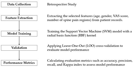 The research diagram is presented in Figure 1, summarizing the main steps of the proposed method. First, clinical data, including age, gender, VAS pain scores, number of spine pain regions, and MRI reports, were collected from 199 patients diagnosed with either spinal fractures or HIVDs. Next, the selected features (age, gender, VAS score, number of spine pain regions) were extracted from patient records. The Support Vector Machine (SVM) model, with a radial basis function (RBF) kernel, was then trained using the collected data. To evaluate the model’s performance, Leave-One-Out (LOO) cross-validation was applied. Finally, evaluation metrics such as accuracy, precision, recall, and the Kappa index were calculated to assess the model’s effectiveness.
