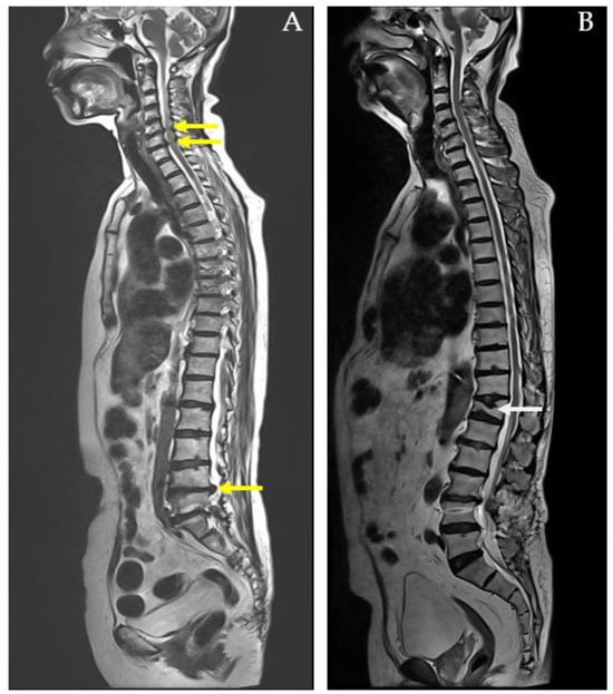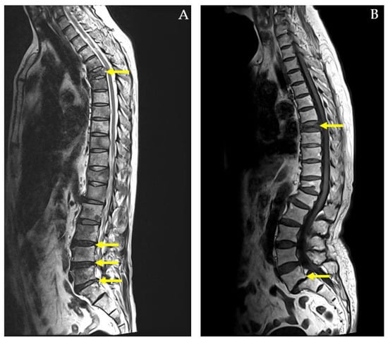 MRI whole-spine imaging demonstrating herniated intervertebral discs (HIVDs) indicated by yellow arrow in (A) and compression fracture indicated by white arrow in (B).