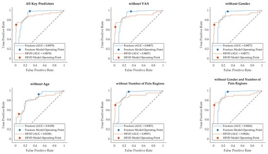 Figure 3 displays the receiver operating characteristic (ROC) curves for the SVM model’s classification of spinal fractures and HIVDs across six different scenarios: with all key predictors and with certain predictors excluded. Each plot shows the true positive rate (sensitivity) against the false positive rate (1-specificity) for both spinal fractures and HIVDs. The area under the curve (AUC) values for each model are presented to assess the performance of the classifier.