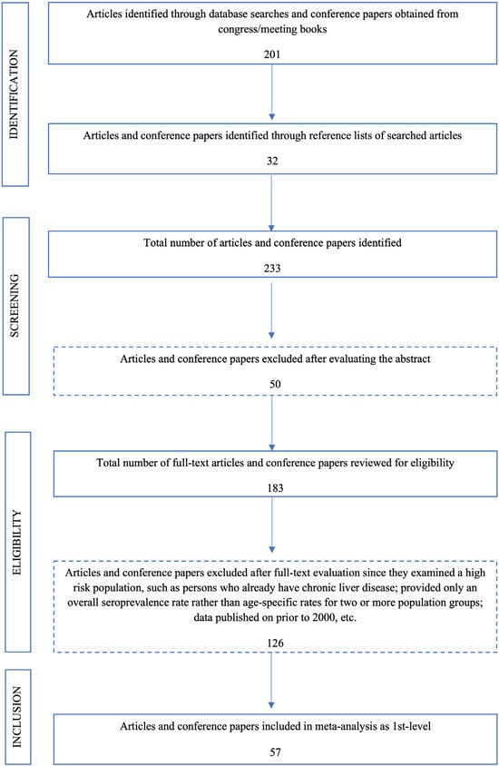 After a systematic literature search, as described above, we reviewed 195 articles and six conference proceedings with age-specific HAV seroprevalence data. The database search using keywords yielded 201 studies. In addition, the search of the bibliographies of these articles yielded 32 publications. After examining the abstracts, 50 irrelevant studies and 126 additional studies that did not meet the inclusion criteria were eliminated. A total of 57 original articles were included in this meta-analysis (Figure 1) [18,19,20,21,22,23,24,25,26,27,28,29,30,31,32,33,34,35,36,37,38,39,40,41,42,43,44,45,46,47,48,49,50,51,52,53,54,55,56,57,58,59,60,61,62,63,64,65,66,67,68,69,70,71,72,73,74].
