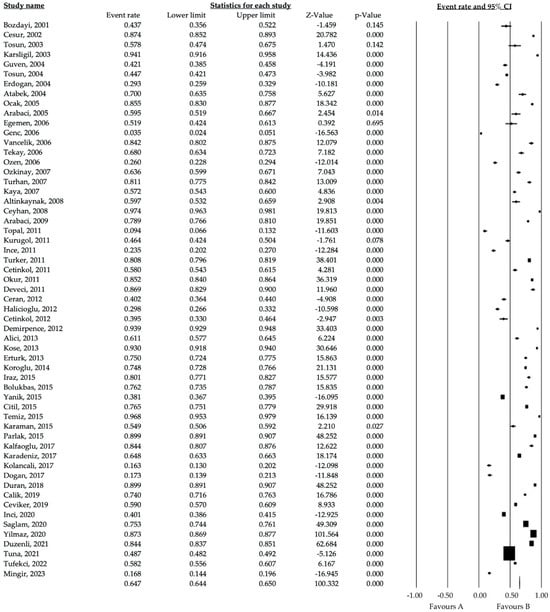 In this meta-analysis, we evaluated 57 published articles on age-specific HAV seroprevalence, including a total of 157,836 patients. Pooling the results extracted from all included reports, independent of study design, yielded an event estimation of 64.5% for the random effects model (95% CI: 58.3–70.2) and 63.7% (95% CI: 63.5–64) for the fixed effects model (Q2 = 25085.65, df = 57, p < 0.0001, I2 = 99.77). In the comprehensive meta-analysis, event rates calculated with fixed and random effects models yielded similar rates and consequently showed high sensitivity (Table 1).