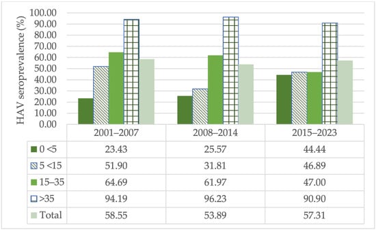 In the 0–<5 age group, the highest HAV prevalence rates were calculated as 44.44%, 25.57% and 23.43% between 2015 and 2023, 2008 and 2014 and 2001 and 2007, respectively. In the 5–<15 age group, the highest HAV prevalence rates were calculated as 51.90%, 46.89% and 31.81% between 2001 and 2007, 2015 and 2023 and 2008 and 2014, respectively. In the 15–35 age group, the highest prevalence rates were calculated as 64.69%, 61.97% and 47% between 2001 and 2007, 2008 and 2014 and 2015 and 2023, respectively. The highest prevalence rates in the age group of >35 years and above were found to be 96.23%, 94.19% and 90.90% between 2008 and 2014, 2001 and 2007 and 2015 and 2023, respectively.