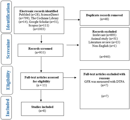 During a literature search in the first phase of identification, 1003 studies were identified and retrieved. During the screening phase, 48 duplicate studies were identified and removed, leaving 955 to be screened for relevance. We then further screened the title and abstract of each study, and 940 studies were identified and removed due to the irrelevancy, including studies performed on animals, reviews, and non-English studies. In the eligibility phase, 15 studies were evaluated through full-text assessment. Finally, in the eligibility phase, seven studies were excluded due to the different reasons listed in Figure 1, leaving eight studies included in the qualitative synthesis and three studies for quantitative synthesis.