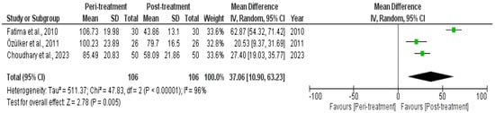 Due to the unavailability of the required data, only three studies were included in the meta-analysis showing the impact of cisplatin on GFR level. A significant (p < 0.01) difference was observed between peri- and post-treatment GFR level, with a 37.06 (95% CI, 10.90–63.23) effect size and 96% heterogeneity (Figure 2).