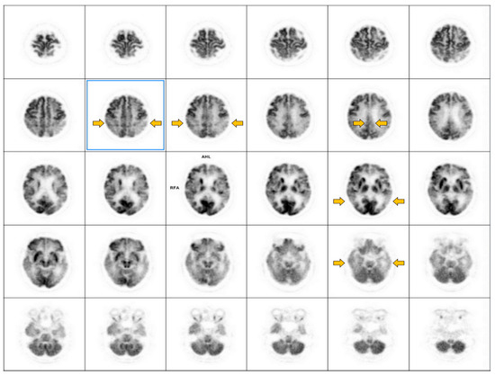 Brain FDG-PET in Alzheimer’s disease displayed in the axial AC–PC plane. Hypometabolism at posterior cingulate gyri, precunei, bilateral parietal and temporal cortices (yellow arrows), with relatively preserved metabolism at bilateral primary sensorimotor areas, visual cortices, basal ganglia, thalami, and cerebelli are observed. (Black shows higher metabolism and gray to white show lower metabolism).