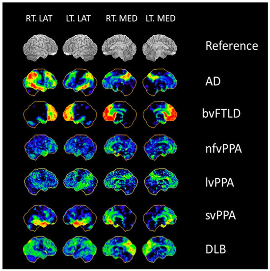 3D-SSP of dementia syndrome. Courtesy: Professor Satoshi Minoshima, modified with permission. LT = left, RT = right, LAT = lateral view, MED = medial view, AD = Alzheimer’s disease, bvFTLD = behavioral variant FTD, nfvPPA = non-fluent variant primary progressive aphasia, lvPPA = logopenic variant primary progressive aphasia, svPPA = semantic variant primary progressive aphasia, DLB = dementia with Lewy bodies. Color shows the specific hypometabolic brain region in each type of dementia.