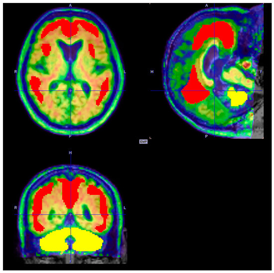 - Minoshima, S.; Frey, K.A.; Koeppe, R.A.; Foster, N.L.; Kuhl, D.E. A diagnostic approach in Alzheimer’s disease using three-dimensional stereotactic surface projections of fluorine-18-FDG PET. J. Nucl. Med. 1995, 36, 1238–1248. [Google Scholar]