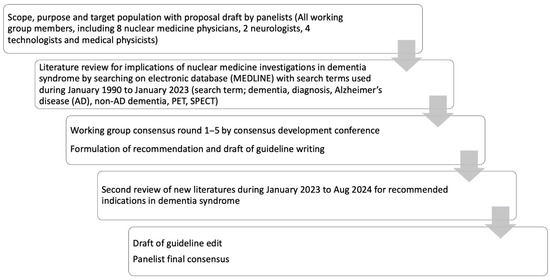 The panelists for this guideline development are nuclear medicine specialists who are representatives from Nuclear Medicine Society of Thailand (S.T., T.K., B.Kh., W.C., T.T., N.W., Ch.C., and P.K.), medical physicists/technologists from Thai Medical Physicist Society (P.P., T.S., N.P, and S.A.), and neurologists from The Neurological Society of Thailand and Dementia Association of Thailand (Y.L. and V.S.). The guideline development process is shown in Scheme 1.