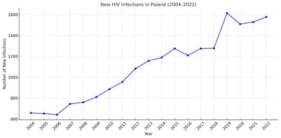 In Poland, since the initiation of HIV diagnostics, there has been an observable increase in the number of infections [], with a peak occurring in 2019. In subsequent years, particularly between 2020 and 2021, the number of new cases decreased, largely due to the impact of the COVID-19 pandemic, which reduced access to testing and healthcare services. However, a recent upward trend has been noted again, partly due to an increased number of tests being performed and advancements in diagnostics []. Despite these improvements, HIV infection continues to pose a serious epidemiological challenge in Poland. The worsening epidemiological situation is particularly concerning, especially considering that the number of new infections worldwide fell by 54% between 1996 and 2021 [] (Figure 1).