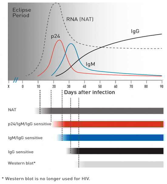 To initiate a discussion on HIV testing, it is crucial to first discuss the available types of tests and their reactivity time, which depends on the target being detected, the detectability of the target, and the concentration at which the test detects the target []. The period between infection and the detection of HIV is known as the eclipse period or window period [,]. The earliest indicator of HIV infection is the presence of HIV RNA in the blood. In half of the individuals infected, HIV RNA can be detected in plasma as early as 12 days after infection. RNA levels continue to rise until around day 20 to 30 of infection, after which they begin to drop but remain quantifiable []. The p24 protein is assayable from approximately day 15 after infection. Its level increases until day 25–30, but after about 50 days, its level becomes indeterminate again []. The presence of HIV triggers the production of IgM antibodies, which appear around day 20. IgG antibody levels rise around day 30–35, causing the subsidence of IgM antibody levels [] (Figure 2).