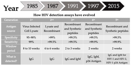 - Alexander, T.S. Human Immunodeficiency Virus Diagnostic Testing: 30 Years of Evolution. Clin. Vaccine Immunol. 2016, 23, 249–253. [Google Scholar] [CrossRef]