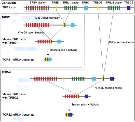 TRB gene rearrangement: the process of TRB gene rearrangement generates mutually exclusive TRBC1 and TRBC2 transcripts. The germline, unrearranged TRB locus consists of one V-gene cluster (TRBV cluster) followed by two ‘D-J-C’ gene clusters (TRBD1-TRBJ1-TRBC1 and TRBD2-TRBJ2-TRBC2). During the recombination of the TRB locus in T-cell development, only one of the ‘D-J-C’ gene clusters is used to form the rearranged TRB locus. The TRB rearrangement occurs in a specific order, with the D-to-J recombination occurring first. This either joins a TRBD1 gene segment with a TRBJ1 gene segment or joins a TRBD2 gene segment with a TRBJ2 gene segment. V-to-DJ recombination occurs next, with a TRBV gene segment being brought adjacent to the recombined DJ segments to form a rearranged TRB locus. If productive VDJ recombination incorporates D- and J-gene segments originating from TRBD1 and TRBJ1 clusters, the rearranged TRB locus will contain TRBC1, which will encode the constant region of the T-cell receptor (TCR) beta. If the D- and J-gene segments originate from TRBD2 and TRBJ2 clusters, this will excise TRBC1, and the constant region of TCRbeta will instead be encoded by TRBC2 [12,13,14].