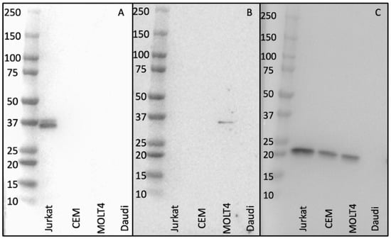 Western blotting demonstrated the specificity of antibody supernatants ROX7 (Figure 2A) and ROX11 (Figure 2B) of lysates from the cell lines Jurkat (TCRbeta1), CEM (low expression level of TCRbeta2), MOLT4 (high expression level of TCRbeta2), and the Daudi (B cell line; negative for TCRbeta1 and TCRbeta2). Control Western blotting was undertaken with a rabbit polyclonal anti-CD3 antibody directed against the 20 kD CD3ε (epsilon) chain [19] (Figure 2C). The presence of a second faint band, with a slightly higher molecular weight, in the Jurkat cell lysate, is likely because TCRbeta can exist in differential glycosylation states [25,26,27,28,29].