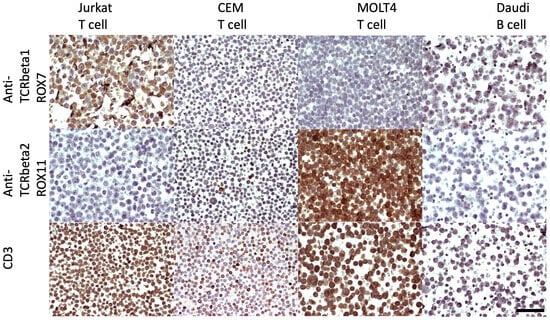 Rabbits were immunized with TCRbeta1- or TCRbeta2-derived peptides in order to produce TCRbeta1-specific (ROX7) and TCRbeta2-specific (ROX11) recombinant rabbit IgG antibodies. Briefly, peptides were synthesized chemically and corresponded to the extracellular region of difference between TRBC1 and TRBC2, including “EDLNKVF” versus “EDLKNVF”, and conjugated to KLH. The specificity of the antibodies binding to the peptide variants was determined by Western blotting and the immunostaining of immortal cell lines as described (Figure 2 and Figure 3), with further confirmation using primary samples and concomitant quantitative real-time reverse transcription PCR (Q-PCR) and in situ hybridization (Table 1). Additional rabbit antibody was produced using recombinant technology via their expression in HEK293T cells. Antibodies were purified by chromatography, using size-exclusion HPLC (Superdex 200, GE28-9909-44, Sigma Aldrich, Gillingham, UK), and were confirmed to be of >98% purity.