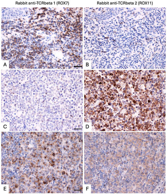 Photomicrographs of FFPE sections of T-cell lymphomas immunostained with ROX7 (anti-TCRbeta1, left-hand panels) and ROX11 (anti-TCRbeta2, right-hand panels). (A,B). Cutaneous lymphoma (transformed mycosis fungoides) in scrotal skin (case 16) in (A,B) showing clear TCRbeta1-restriction. (C,D). Peripheral T-cell lymphoma, NOS, in a lymph node (case 11), showing clear, TCRbeta2-restriction. (E,F). Peripheral T-cell lymphoma, NOS, in a lymph node (case 9), showing clear well-defined membranous TCRbeta1 expression, with some weaker cytoplasmic TCRbeta2 co-expressions. All results were corroborated by Q-PCR (Table 5) and BaseScopeTM (Supplementary Figure S5). Scale bars (left-hand panels) are 20 microns and pertain to paired left and right-hand panels.