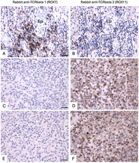 Photomicrographs of FFPE sections of T-cell lymphomas immunostained with ROX7 (anti-TCRbeta1, left-hand panels) and ROX11 (anti-TCRbeta2, right-hand panels). (A,B). Unclassifiable CD4+ cutaneous T-cell lymphoma (case 13) showing TCRbeta1-restriction. (C,D). Cutaneous T-cell lymphoma (transformed mycosis fungoides) (case 17) showing TCRbeta2 restriction, although at the transcript level, there is cytoplasmic TRBC2, as seen in all the other cases examined, but very strong nuclear TRBC1 (Supplementary Figure S6, panels C and D). (E,F). CD8-positive cutaneous T-cell lymphoma, possibly acral lymphoma (case 21), showing clear TCRbeta2-restriction. Scale bars (left-hand panels) are 20 microns and pertain to paired left and right-hand panels. BaseScopeTM corroboration is included in Supplementary Figure S6, with Q-PCR data in Table 5. Ep, epidermis.