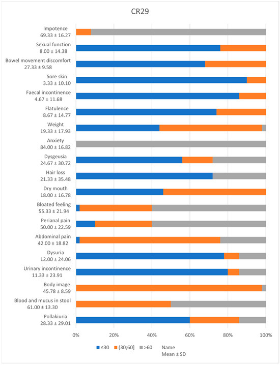 The CR29 questionnaire asked the subjects to list their symptoms that occurred in the previous week. Scores can be linearly transformed to give a score between 0 and 100. Higher scores indicate better functional status and a higher level of symptom control on the symptom scale. According to the patients’ answers, the most affected systems are the excretory, the reproductive, and the gastrointestinal. The patients are complaining of lower sexual function, faecal and urinary incontinence, pollakiuria, and discomfort due to increased bowel movements. Among these, we can also list blood and mucus in stool, pain (abdominal and perianal), and bloating as further drawbacks. The up-to-date literature also reveals that rectal (rather than colon) cancer has a negative impact on sexual health and gastrointestinal function but has no effect on overall QoL [27].