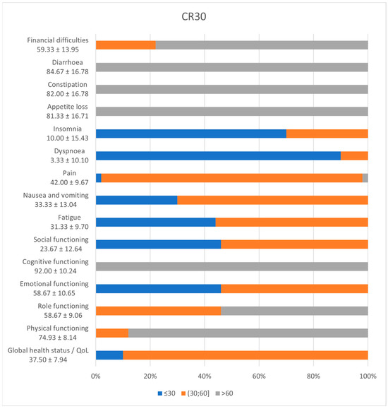 CR 30 functioning scales depict high scores for cognitive (100%, 95% CI [0.91–1]), physical (88%, 95% CI [0.75–0.95]), and role (88%, 95% CI [0.39–0.68]) functions and low scores (<50) for emotional (98%, 95% CI [0.88–0.99]) and social (100%, 95% CI [0.91–1]) functions. The global health status has a mean of 37.50 ± 7.94. The symptoms scale shows that all patients scored underneath 50 for fatigue, dyspnoea, insomnia, nausea, and vomiting, but above 60 for appetite loss, constipation, and diarrhoea and 78% (95% CI [0.64–0.88]) for financial difficulties.