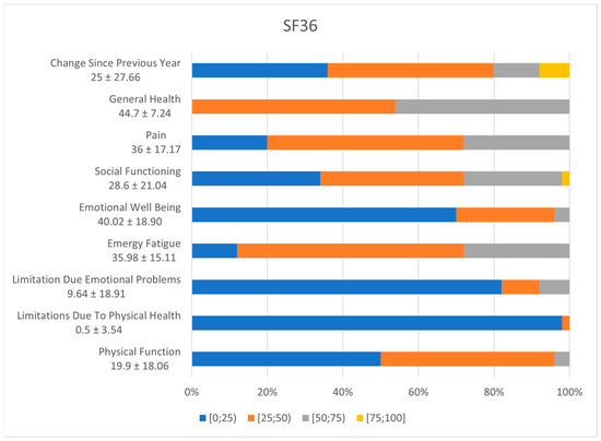 The SF-36 questionnaire is the short version of the Medical Outcome Study (36-Item Short Form Survey Instrument), which is used as a health indicator for the general population. The questionnaire is not focused on a specific disease, and it can be applied to patients with different pathologies. The questionnaire focuses on 8 parameters: physical functioning (PF), role physical (RP), body pain (BP), general health (GH), vitality (VT), social functioning (SF), role emotional (RE), and mental health (MH) [11].