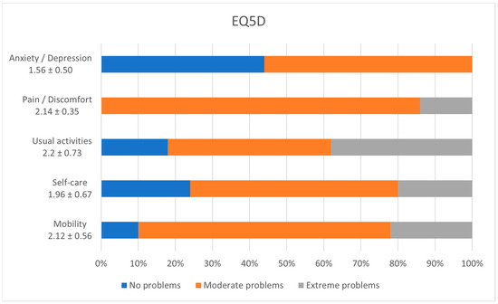 Figure 4 details the resulting scoring of the EQ5D questionnaire, outlining that most of the patients in the group faced moderate problems with pain and discomfort (86%, 95% CI [0.73–0.94]), anxiety and depression (56%, 95% CI [0.73–0.94]), self-care (56%, 95% CI [0.41–0.70]), mobility (68%, 95% CI [0.53–0.80]), and usual activities (44%, 95% CI [0.30–0.59]).