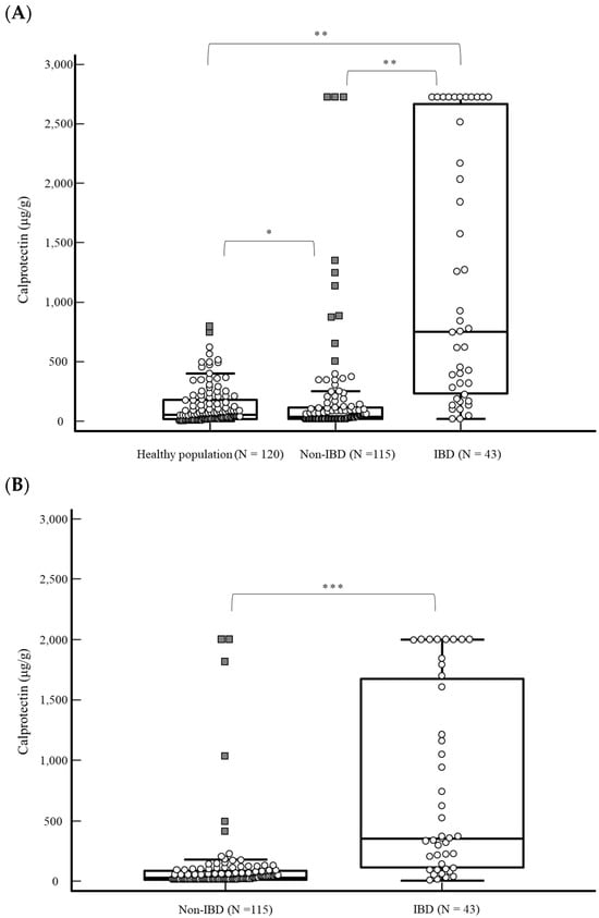 (A) Fecal calprotectin concentration measured using OC-Sensor Pledia in healthy population and patients without and with IBD (median = 56.5, 34, and 751 μg/g, respectively). (B) Fecal calprotectin concentration measured using Phadia 250 in patients without and with IBD (median = 29.0 and 355.0 μg/g, respectively). * p = 0.1394, ** p < 0.0001, *** p < 0.001. Abbreviations: IBD, inflammatory bowel disease; N, number.