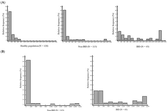 (A) Histograms of fecal calprotectin measured using OC-Sensor Pledia in the healthy population and patients without and with IBD. (B) Histograms of fecal calprotectin measured using Phadia 250 in patients without and with IBD. Abbreviations: IBD, inflammatory bowel disease; N, number.