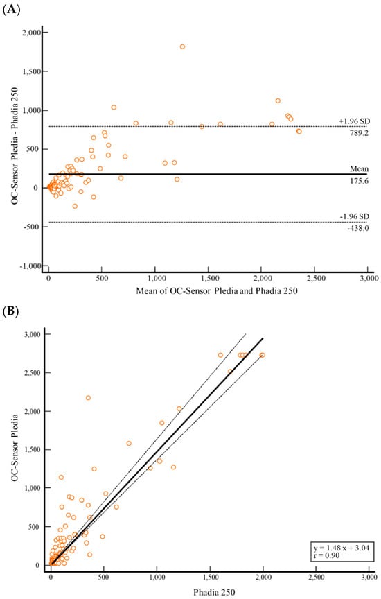 The absolute mean difference of f-Cal was 175.6 (95% CI, 126.4–224.8) and ranged from −438.0 to 789.2 between OC-FCa and Phadia 250 (Figure 3A). The mean difference (%) of f-Cal was 46.0% (95% CI, 37.6–54.4) and ranged from −58.5% to 150.5% between OC-FCa and Phadia 250. In the Passing–Bablok correlation, the f-Cal values of OC-FCa and Phadia 250 showed a high correlation (r = 0.90) (Figure 3B).