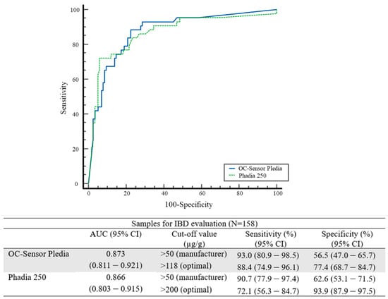 OC-FCa and Phadia 250 showed moderate accuracy (AUC = 0.873 and 0.866, respectively) in diagnosing IBD; however, they did not show a significant difference (p = 0.616) (Figure 4). Based on the manufacturer’s cut-off value, the sensitivities of OC-FCa and Phadia 250 were 93.0% and 90.7%, respectively, and the specificities of OC-FCa and Phadia 250 were 56.5% and 62.6%, respectively. According to the optimal cut-off values, the sensitivities of OC-FCa and Phadia 250 decreased (88.4% and 72.1%, respectively); however, their specificities improved (77.4% and 93.9%, respectively) (Figure 4).