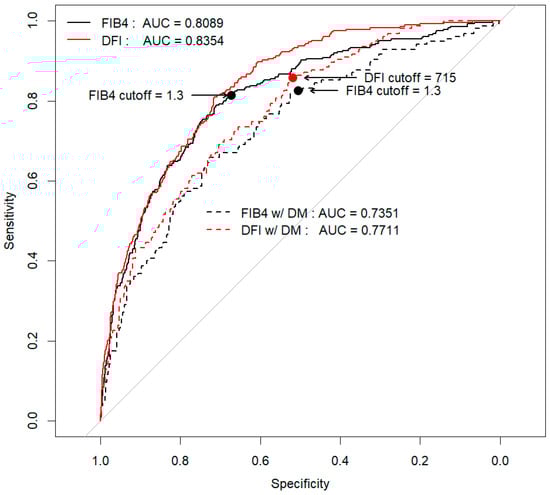 - Kim, R.G.; Deng, J.; Reaso, J.N.; Grenert, J.P.; Khalili, M. Noninvasive Fibrosis Screening in Fatty Liver Disease Among Vulnerable Populations: Impact of Diabetes and Obesity on FIB-4 Score Accuracy. Diabetes Care 2022, 45, 2449–2451. [Google Scholar] [CrossRef]