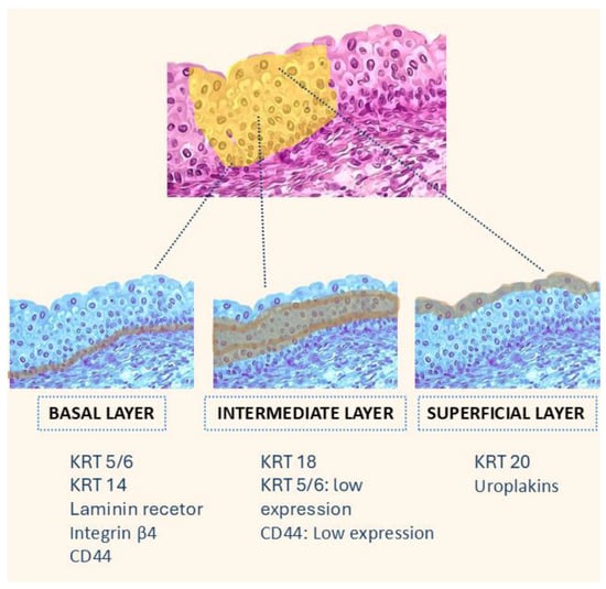 - Jung, M.; Kim, B.; Moon, K.C. Immunohistochemistry of cytokeratin (CK) 5/6, CD44 and CK20 as prognostic biomarkers of non-muscle-invasive papillary upper tract urothelial carcinoma. Histopathology 2019, 74, 483–493. [Google Scholar] [CrossRef] [PubMed]
