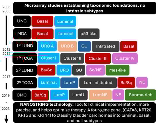 - López-Beltrán, A.; Blanca, A.; Cimadamore, A.; Gogna, R.; Montironi, R.; Cheng, L. Molecular Classification of Bladder Urothelial Carcinoma Using NanoString-Based Gene Expression Analysis. Cancers 2021, 13, 5500. [Google Scholar] [CrossRef] [PubMed]
