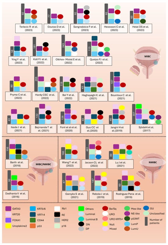 - Warrick, J.I.; Al-Ahmadie, H.; Berman, D.M.; Black, P.C.; Flaig, T.W.; Höglund, M.; Bubendorf, L.; van der Kwast, T.H.; Cheng, L.; The Members of the ISUP Bladder Tumor Consensus Panel. International Society of Urological Pathology Consensus Conference on Current Issues in Bladder Cancer. Working Group 4: Molecular Subtypes of Bladder Cancer-Principles of Classification and Emerging Clinical Utility. Am. J. Surg. Pathol. 2024, 48, e32–e42. [Google Scholar] [CrossRef] [PubMed]