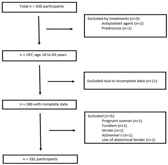 Finally, 281 participants remained for data analysis, the results of which are summarized in Figure 1. Additionally, having a positive COVID-19 diagnosis and having renal insufficiency were considered exclusion criteria; however, no cases of these were presented.
