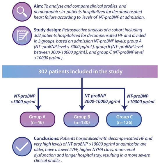 Graphical abstract presenting the study design. A total of 302 patients were divided into three groups: Group A—NT-proBNP < 3000 pg/mL; Group B—NT-proBNP between 3000–10,000 pg/mL; Group C—NT-proBNP > 10,000 pg/mL.