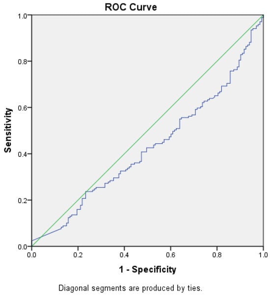 The area under the ROC curve for the level of NT-proBNP and the diagnosis of HF without renal impairment was 0.426 (p = 0.026, 95% CI [0.361–0.49]), and for NT-proBNP level and renal impairment was 0.574 (p = 0.026, 95% CI [0.511–0.639]), reaching the statistical significance threshold in both situations. Thus, we can conclude that there might be an association between HF with or without concomitant renal impairment and NT-proBNP levels, but we could not demonstrate that this test, NT-proBNP level, can be used as a diagnostic test to predict HF (AUROC values closer to 0.5 than 1, the expected value) and no cut-off point could be established for the NT-proBNP level.