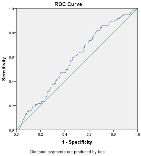 ROC curve (blue) for NT-proBNP levels as a predictor for HF with CKD (AUC = 0.574). Green—random classifier curve.