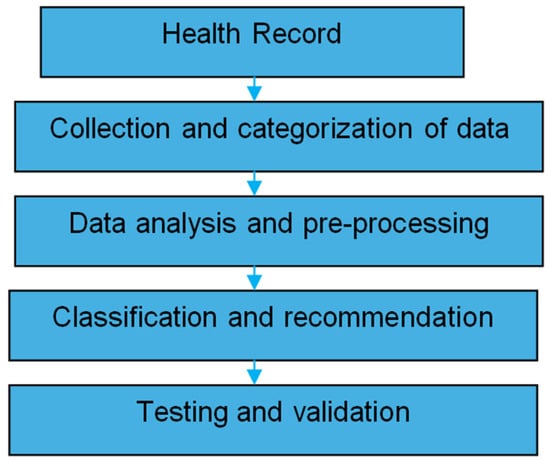 Recommender systems are widely used to provide personalized recommendations to users. They can suggest products for purchase, music for listening, or news articles for reading [,]. In the healthcare sector, there is a growing need for precise information about the specific type of treatment required for patients, whether it be emergency care or regular treatment for a particular condition []. In the age of abundant online data, recommendation systems have proven effective in addressing the challenge of information overload in diverse industries by providing relevant recommendations []. Recommendation systems have proven valuable in healthcare by helping individuals make informed decisions about their well-being. These systems offer personalized technological advice to support health monitoring and improvement. Health recommendation systems can help pinpoint individuals at risk for specific diseases by analyzing their health data and historical trends [,,]. By suggesting preventive measures and early detection strategies, these systems play a role in lowering the incidence and impact of diseases. Machine learning (ML) is a type of statistical analysis that facilitates the creation of modeling techniques for such recommendation systems. ML methods, or classification methods, may take in information, analyze everything statistically, and determine the future based on statistical architectural features []. Figure 1 presents a flowchart that outlines the entire process, from data collection to the generation of recommendations []. The workflow begins with the acquisition of diverse datasets, which are then meticulously processed and labeled. This pre-processing step is crucial for preparing the data for model training. The labeled data are used to develop and train recommendation models, which are subsequently employed to classify and generate tailored recommendations based on the input data. This structured approach ensures that the recommendation system is accurate and effective in delivering personalized health insights. The choice of algorithms and their performance evaluation are critical for the system’s accuracy and effectiveness in providing relevant health recommendations.