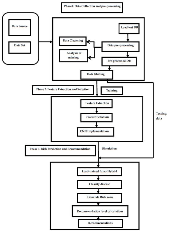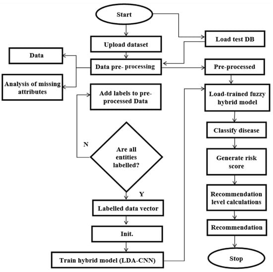 Our methodology involves utilizing an LDA technique combined with CNN and GWO techniques to design a healthcare recommendation system that can predict the severity of multiple diseases and provide better recommendations. This approach aims to integrate linear discrimination analysis and the wolf optimization technique into healthcare recommendation systems for diseases such as lung and kidney disease. Our primary objective is to build an advanced recommendation system that utilizes patient data to provide accurate disease predictions. By analyzing various health metrics and personal information, our system aims to deliver reliable forecasts that can assist healthcare professionals in diagnosing and managing these conditions effectively. Frequency level is determined by extracting features from pre-processed patient logs using CNN and GWO techniques. The proposed workflow, shown in Figure 2, includes various processing modules within the hybrid recommendation system. Initially, the uploaded dataset goes through data pre-processing modules to eliminate undesirable elements and analyze and handle empty columns. This ensures that the dataset is normalized for training purposes. Subsequently, the pre-processed data are passed through a labeling module, which labels all patient entries. These labels are essential in constructing training models and categorizing results based on dataset entries. The second significant module is dedicated to testing. It helps determine test data labels and generates recommendations by taking into consideration risk scores and disease severity levels. These calculated values are crucial in guiding the recommendation engine to provide tailored suggestions. After all the modules have processed the information and generated results, the performance parameters of the proposed hybrid architecture are computed. This marks the completion of the current thread’s operation.