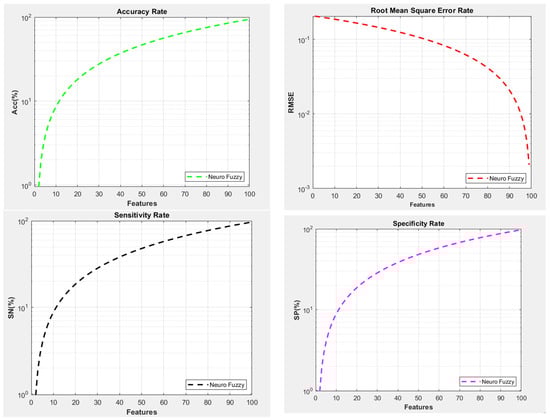 The existing neuro-fuzzy model had an RMSE of 0.2057. Accuracy is another important factor in evaluating trained models. The higher the accuracy, the better the model is at classification and recommendation. The existing neuro-fuzzy approach had an overall accuracy of 94.2% and depended on positive and negative samples in the given categories. Specificity is a part of accuracy that measures the model’s ability to classify negative samples in the dataset. A higher specificity indicates better performance. The neuro-fuzzy model had a specificity of 97.43. Sensitivity, also known as true positive rate, is related to the model’s ability to classify positive samples in the dataset. A higher sensitivity indicates better performance. The neuro-fuzzy model had a sensitivity of 97.43. Data are collected from the local repository and pre-processed with various filters to generate a normalized dataset for the model. The data are then divided into training and testing sets with associated labels. The model is trained with the training set and stored in the MAT database for use in further multi-level training modules.
