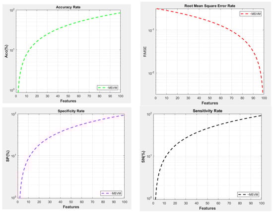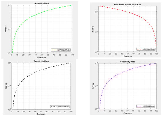 The proposed architecture shows an RMSE of 0.1878 in the test case. Accuracy is another factor that determines the performance of trained models. The higher the accuracy, the better the model is considered in terms of classification and recommendation. Figure 8 shows the proposed accuracy for the current test case, which is 98.19, with 100 feature sets on the X-axis. The terms “specificity” and “sensitivity” are used to evaluate the performance of a classifier on a given dataset. Specificity measures the rate of correctly classified negative samples compared to the quantity of actual negative samples in the dataset. The proposed LDW-CNN model (shown in Figure 8) has a high specificity rate of 99.18, which means it accurately evaluates negative samples in the testing set. On the other hand, sensitivity measures the actual positive rate, or the rate of correctly classified positive samples, compared to the quantity of actual positive samples in the dataset. The proposed LDW-CNN model showed a sensitivity of 99.08 for 100 feature sets at the X level in Figure 8. This demonstrates a higher rate of sensitivity compared to other executions.